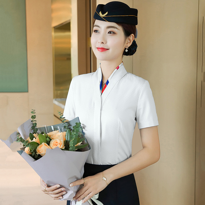 Kemeja Profesional Pakaian Kerja Wanita Kecantikan Lengan Pendek Seragam Pramugari Penerimaan Layanan Pelanggan Meja Depan Pelayan Restoran Hotel