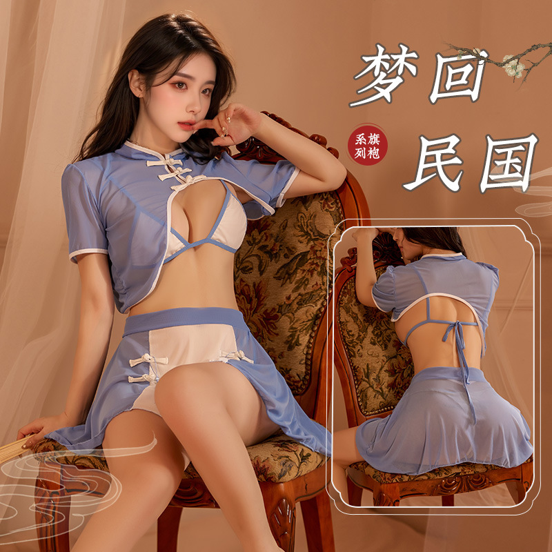 Pakaian dalam lingerie seksi menggoda, setelan piyama keinginan murni wanita, seragam cheongsam punggung terbuka gesper vintage, pakaian dalam menggoda