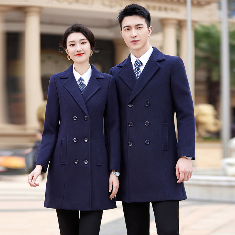 Mantel wol biru dongker pakaian bisnis bank kelas atas meja depan pakaian kerja pramugari perhiasan toko mantel wol