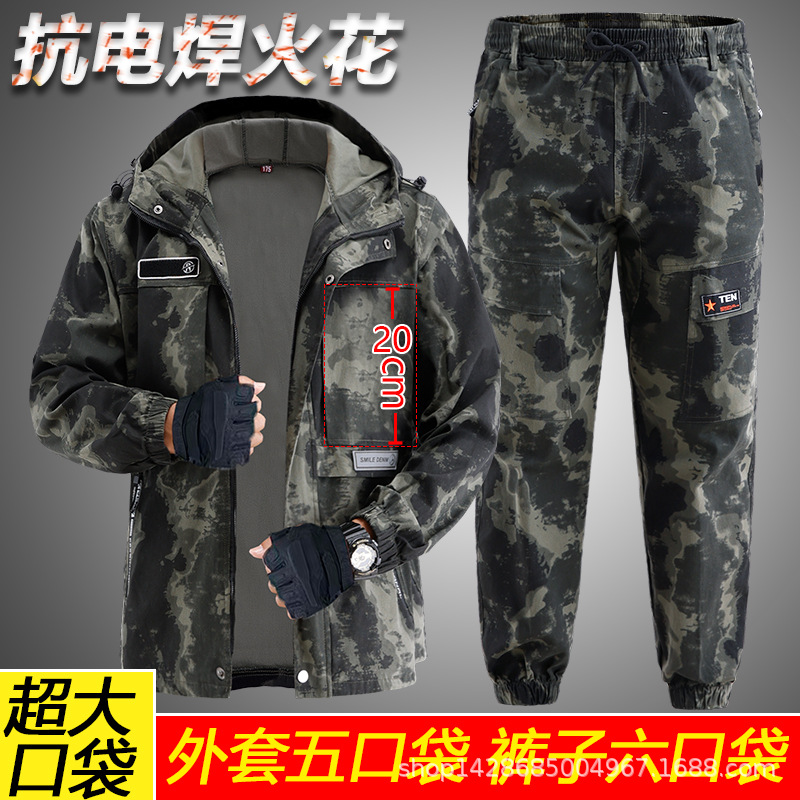 Setelan baju kerja regang katun, atasan tunggal/celana Musim Semi dan Musim Gugur, jaket kamuflase, pakaian pelindung kerja, perbaikan mobil pengelasan, anti melepuh
