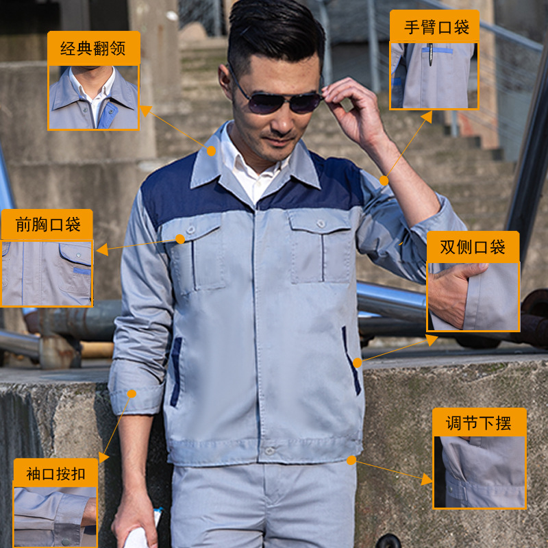 Setelan pakaian kerja berkancing pria dan wanita, pakaian pabrik jahitan biru dan abu-abu, situs konstruksi perbaikan otomatis tahan aus musim semi dan musim gugur, pakaian pelindung kerja