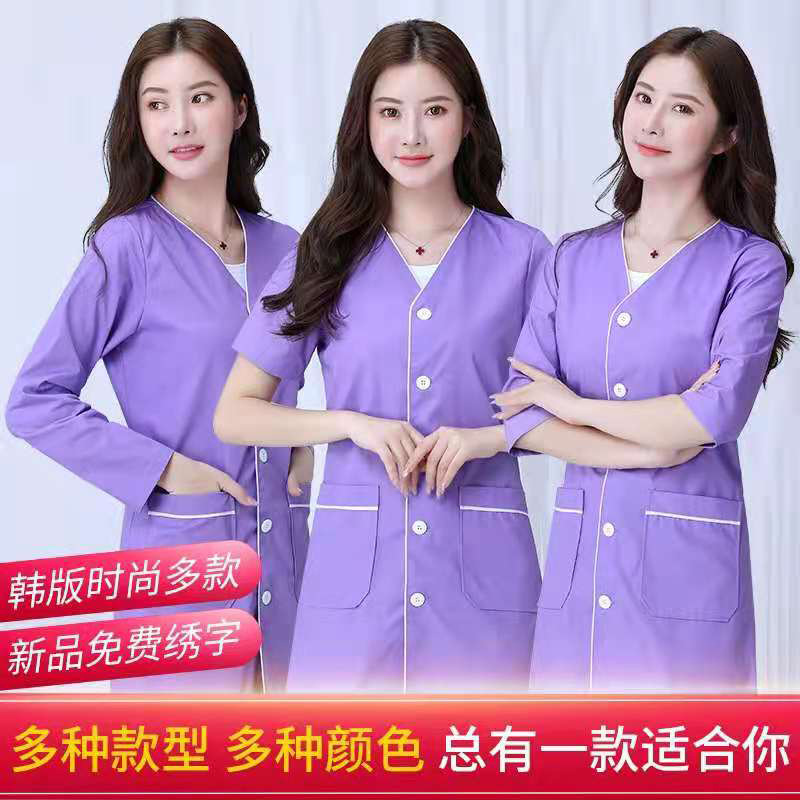 Ungu tanpa kerah salon kecantikan tato bordir gaun putih lengan pendek gaya Korea pakaian perawat rumah sakit tato bordir overall