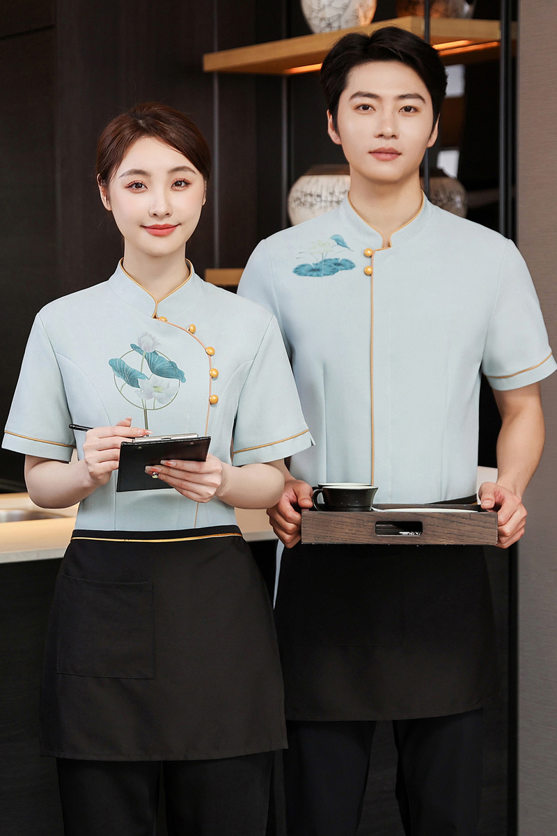 Baju kerja pelayan katering Cina, pakaian kerja wanita lengan pendek gaya Cina hotel rumah teh restoran pakaian kerja musim panas