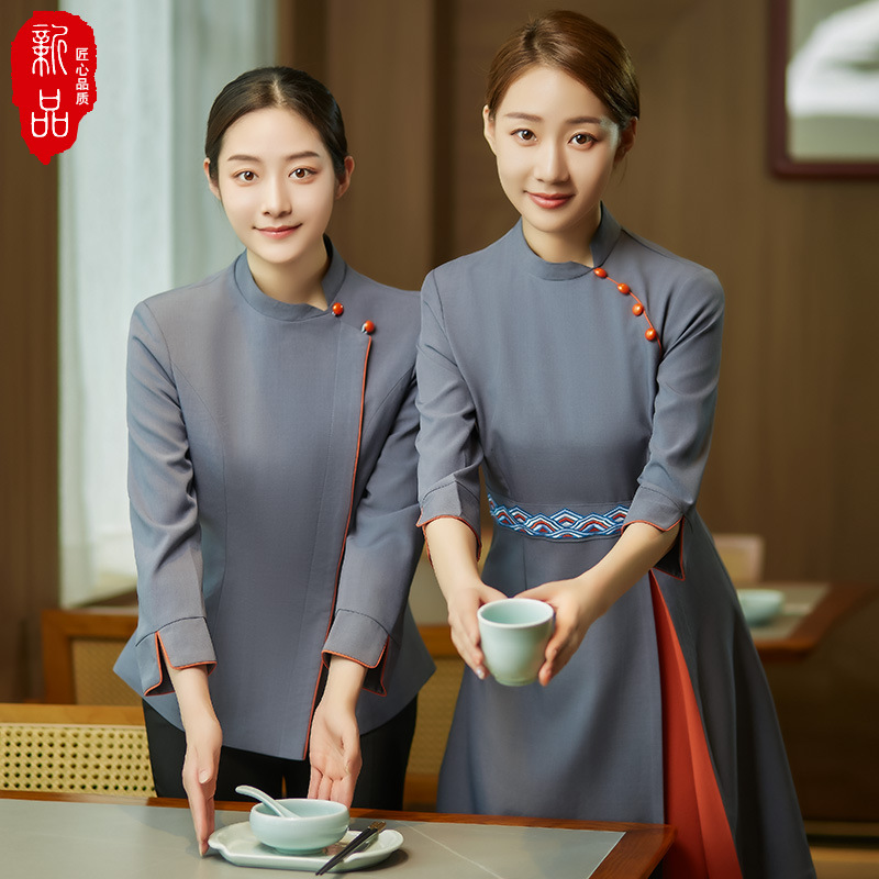 Pakaian Kerja Katering Gaya Cina Gaya Etnik Model Baru Fitur Hotel Restoran Pelayan Teh Lengan Panjang Musim Gugur dan Musim Dingin