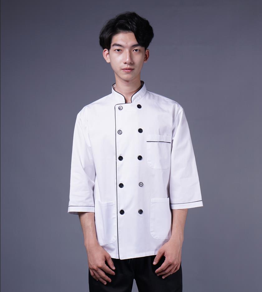 Pakaian kerja restoran restoran, gaya tipis tidak tebal putih tepi hitam lengan setengah baju koki tersedia empat musim tiga saku