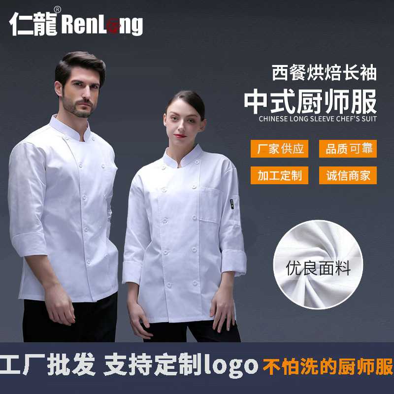 Pakaian koki pria lengan panjang, baju koki logo bordir udara putih lengan panjang, pakaian kerja restoran hotel, baju koki