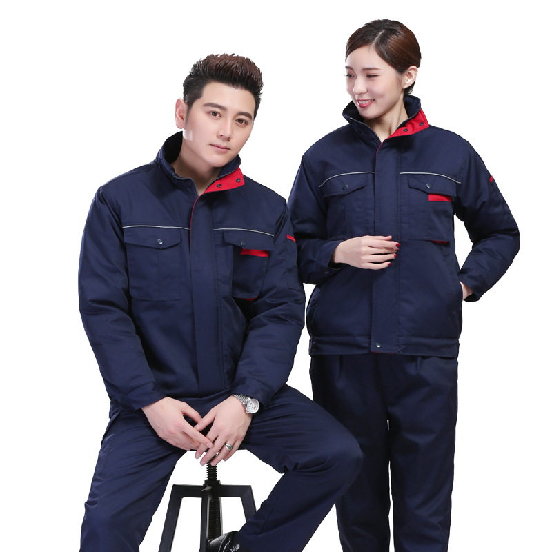 Pakaian kerja tahan angin musim dingin, pakaian bengkel tubuh kecil pendek kerah berdiri biru Lengan benang dingin