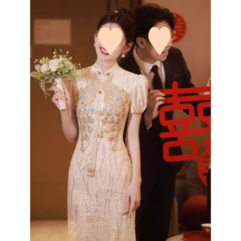 Pakaian Bersulang Warna Emas Sampanye Cheongsam Ekor Ikan Bergaya Senior Pengantin Wanita Model Baru 2025 Pakaian Pengantin Musim Panas Pakaian Pengantin