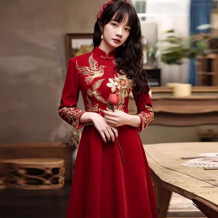 Gaun cheongsam baru yang ditingkatkan tahun 2025, warna merah, gaya muda, gaun pengantin Cina untuk gadis, gaun ucapan pengantin, musim gugur dan musim dingin