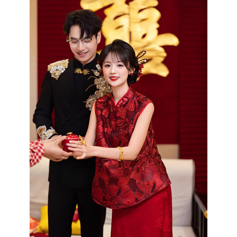 Cheongsam Modifikasi Gaya Tiongkok Baru Kelas Atas Musim Panas Set Jubah Pagi Pernikahan Pengantin Wanita Model Baru 2025