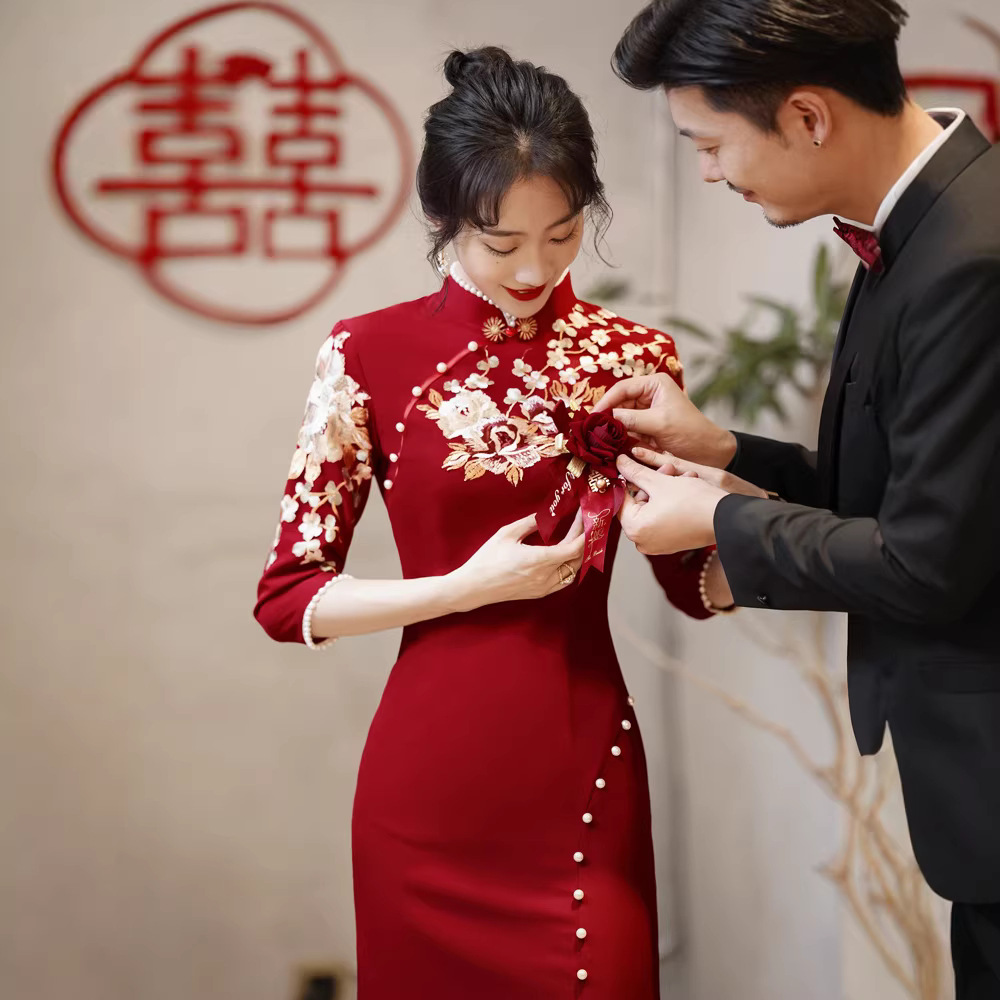 Gaun qipao lengan panjang modifikasi gaya Cina baru untuk acara bersulang, gaun pengantin model baru 2026, gaun tunangan dan gaun pulang kampung model ekor ikan untuk wanita.