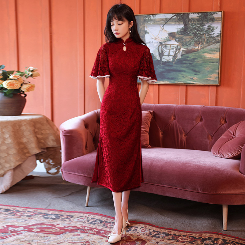 Gaun cheongsam model fishtail, gaun pengantin elegan warna burgundy berenda lengan panjang untuk pernikahan dan pertunangan, gaun malam wanita