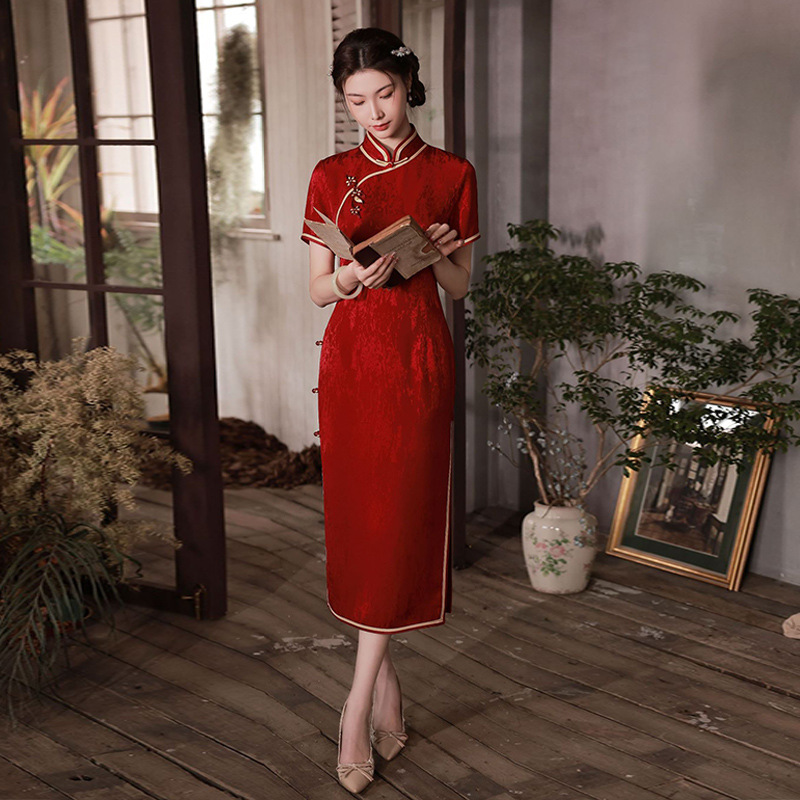 Gaun ibu pernikahan musim panas gaun pernikahan ibu mertua merah panjang ditingkatkan gaun cheongsam wanita dewasa