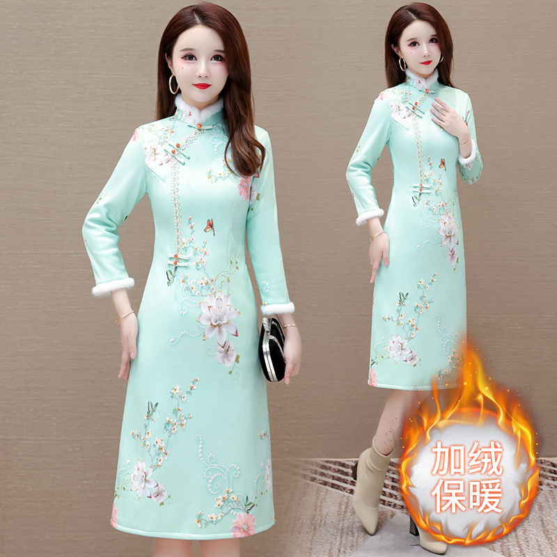 Tembakan nyata gaun cheongsam poetic, pakaian ramping elegan panjang setengah tebal fleece musim dingin