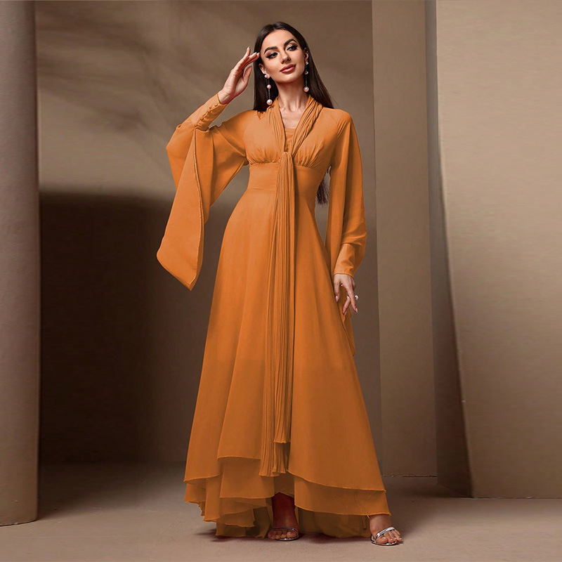 Gaun Sifon Perdagangan Luar Negeri Timur Tengah Lintas Batas Eropa dan Amerika KY805-6 Gaun Pesta Pesta Kerah V Daun Teratai Dubai Pakaian Pengiring Pengantin