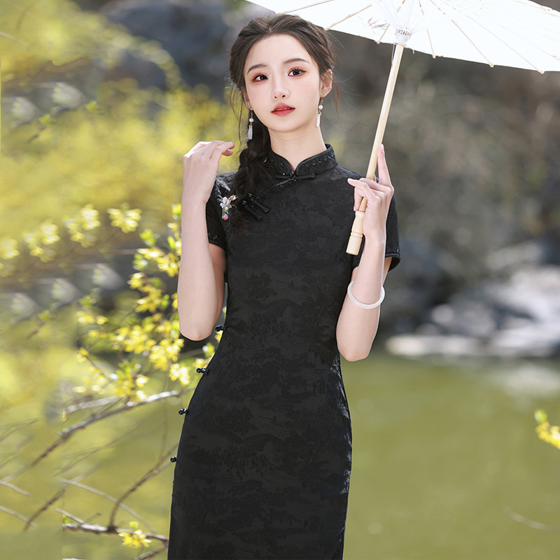 Cheongsam Modifikasi Model Baru Musim Panas Warna Hitam Rok Cheongsam Model Panjang Sedang Elegan Ramping Gaun Gaun Gaun Elegan Desain