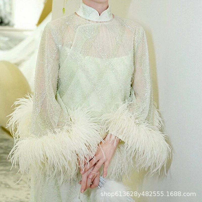Kostum bulu merah seksi gaya Cina gaun malam perayaan elegan panjang cheongsam berlebihan catwalk panggung wanita