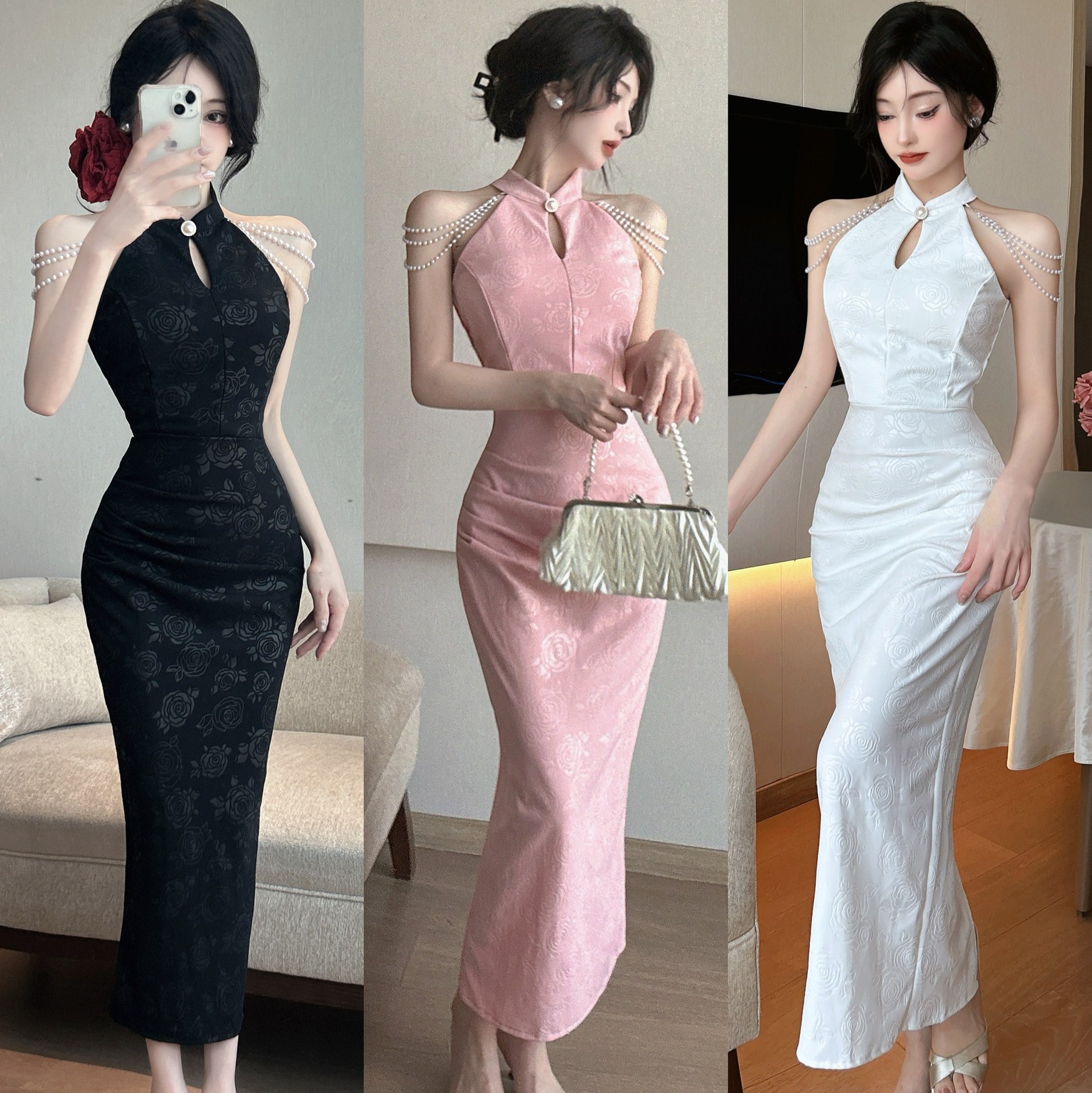 4855 seksi off-the-shoulder rantai dekorasi meningkatkan panjang cheongsam gaun ketat jacquard berdiri kerah gaun kelas tinggi