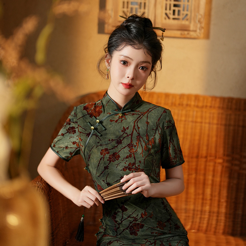 Gaun cheongsam musim gugur baru populer lapisan tunggal kain beludru bunga elastis tinggi ramping temperamen gaun cheongsam panjang kecil