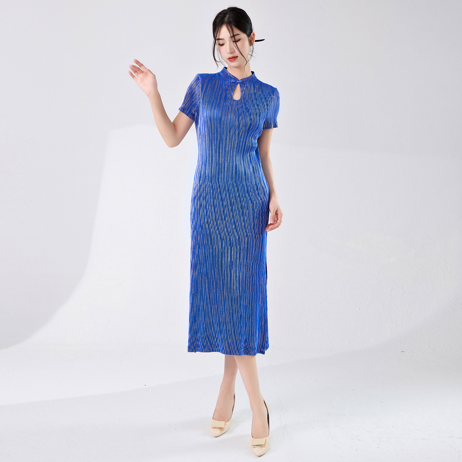 Gaun cheongsam, gaun cheongsam sehari-hari, warna diagonal, kerah berdiri, lembut dan ringan
