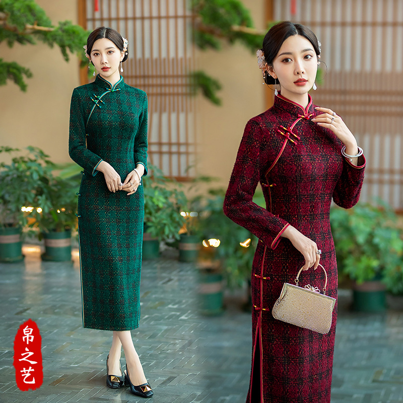Gaun cheongsam wanita paruh baya berbahan beludru mink untuk musim gugur dan musim dingin, gaun cheongsam lengan panjang motif houndstooth hangat untuk musim dingin dengan belahan tinggi.