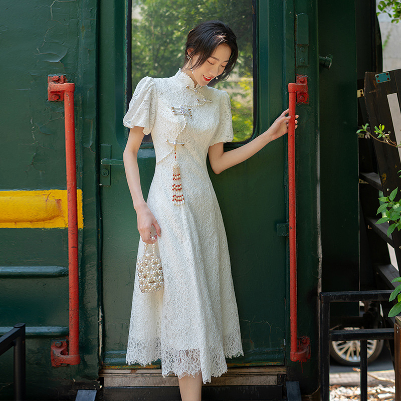 Cheongsam renda merah lengan pendek wanita, pakaian roti bakar harian ditingkatkan kelas atas musim panas baru 2023