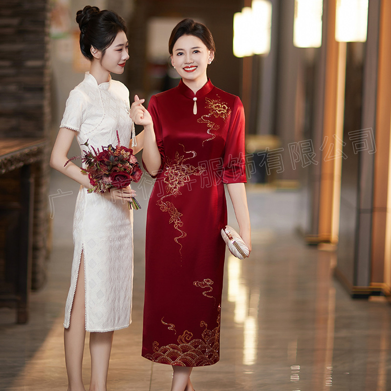 Gaun jamuan pernikahan cheongsam bahagia, kelas atas ibu mertua musim panas baru ditingkatkan pakaian ibu mertua gaun elegan elegan elegan