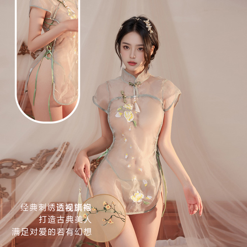 Seragam seksi wanita seksi transparan panas klasik berdiri kerah seksi cheongsam retro bordir split piyama seksi