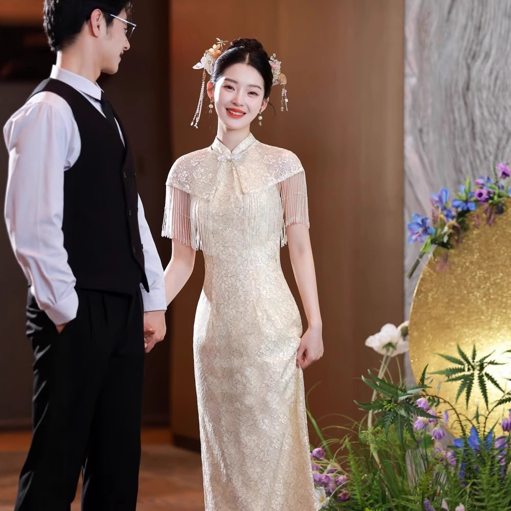 Cheongsam Pertunangan Warna Sampanye Model Baru Pakaian Bersulang Gaun Pernikahan Pengantin Wanita Gaun Ramping Gaya Tiongkok Baru