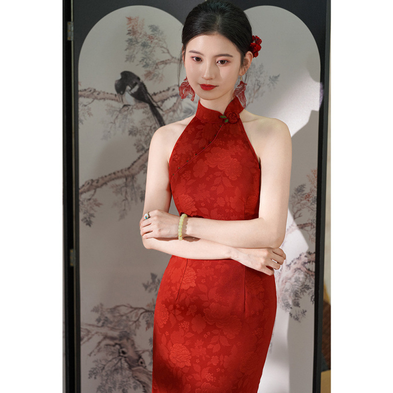 Cheongsam Merah Merah Shengyi Pakaian Bersulang Pernikahan Pertunangan Model Baru Gaya Tiongkok 2025 Model Baru Wanita Gaya Muda Tanpa Lengan Gantung Leher Model Tinggi