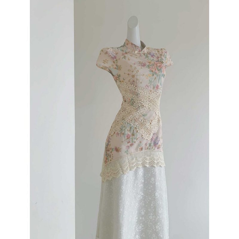 Cheongsam Modifikasi Cetak Dua Potong Palsu Gaya Tiongkok Baru Rok Cheongsam Berongga Renda Sambungan Musim Panas 2025