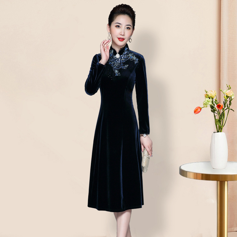 Gaun ibu elegan baru cheongsam musim gugur dan musim dingin dimodifikasi gaun pernikahan harian bahagia ibu mertua gaun beludru