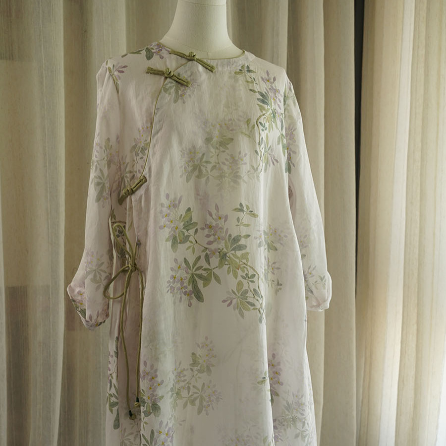 Foto asli gaun cheongsam bergaya retro Cina artistik yang telah ditingkatkan, gaun ramie bermotif baru musim panas 2025.