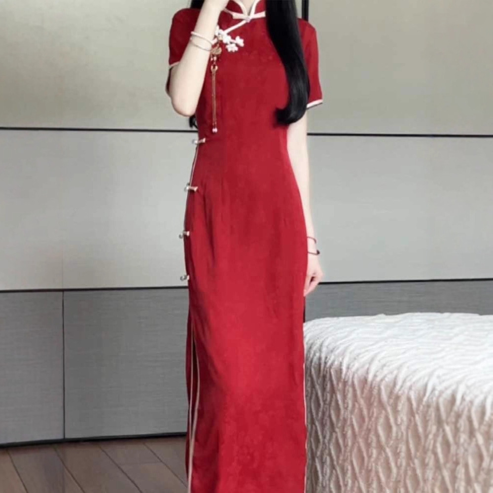 新中式盘口复古红色旗袍连衣裙夏季新款改良版礼服收腰紧身裙子