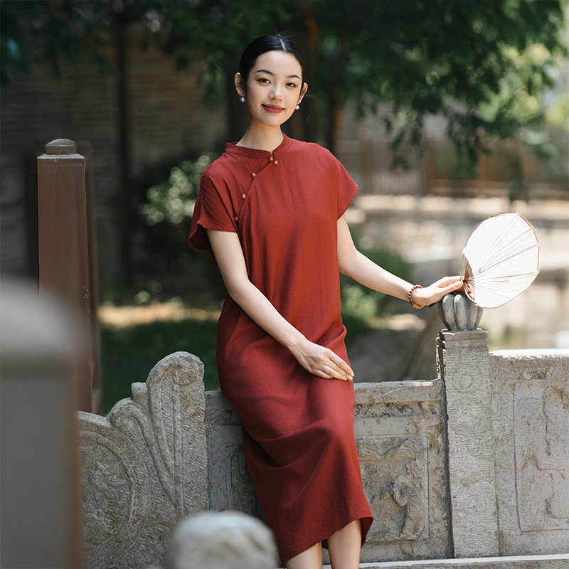 Pakaian Wanita Gaya Tiongkok Baru Rok Cheongsam Modifikasi Model Baru Musim Panas Gaya Tiongkok Gaun Linen Lengan Pendek Gaya Senior Gaya Tiongkok Grosir