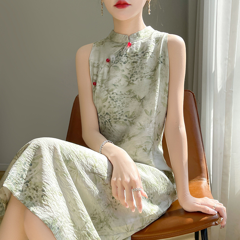 Gaun tanpa lengan gesper cetakan vintage wanita, gaun cheongsam ditingkatkan gaya Tiongkok Musim Panas 2024