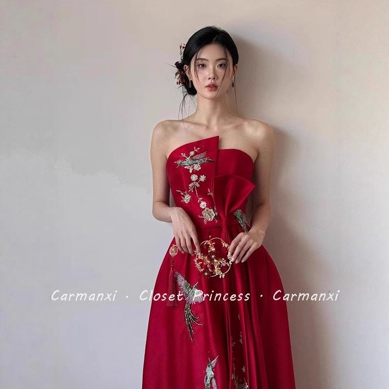 Gaun Acara Penting Wanita Gaun Warna Merah Gaya Tiongkok Baru Model Baru 2025 Baju Pagi Minzhong Mewah Ringan Kelas Atas Pakaian Bersulang