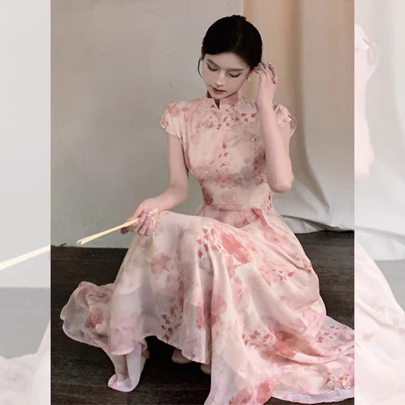 Gaun lengan pendek motif bunga gaya Tiongkok, gaun cheongsam setengah panjang, lembut, merah muda, peningkatan pinggang ketat musim panas, untuk wanita