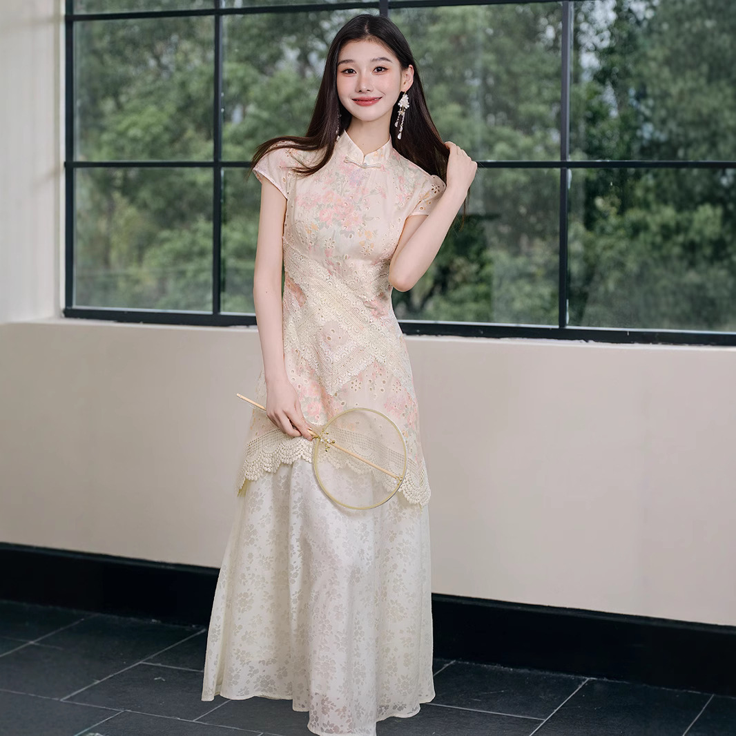 Rok Pinggul Bunga Renda Cheongsam Rok Unik Unik Chic Gaya Tiongkok Baru Gaun Berongga Rok Cheongsam Modifikasi Wanita Musim Panas