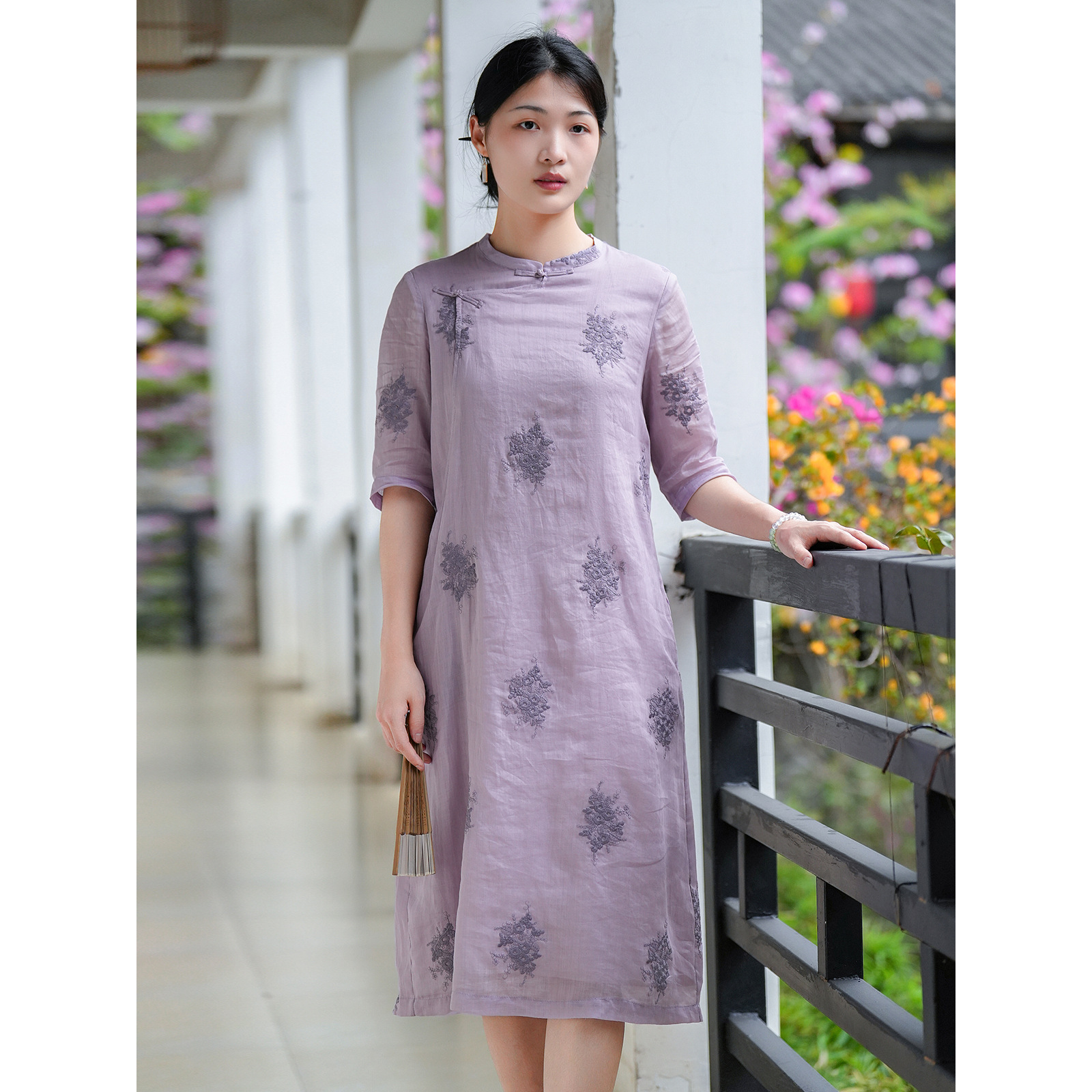 Qingyunyun/rami buatan tangan gesper meningkatkan gaun cheongsam baju teh retro Cina artistik gaun midi