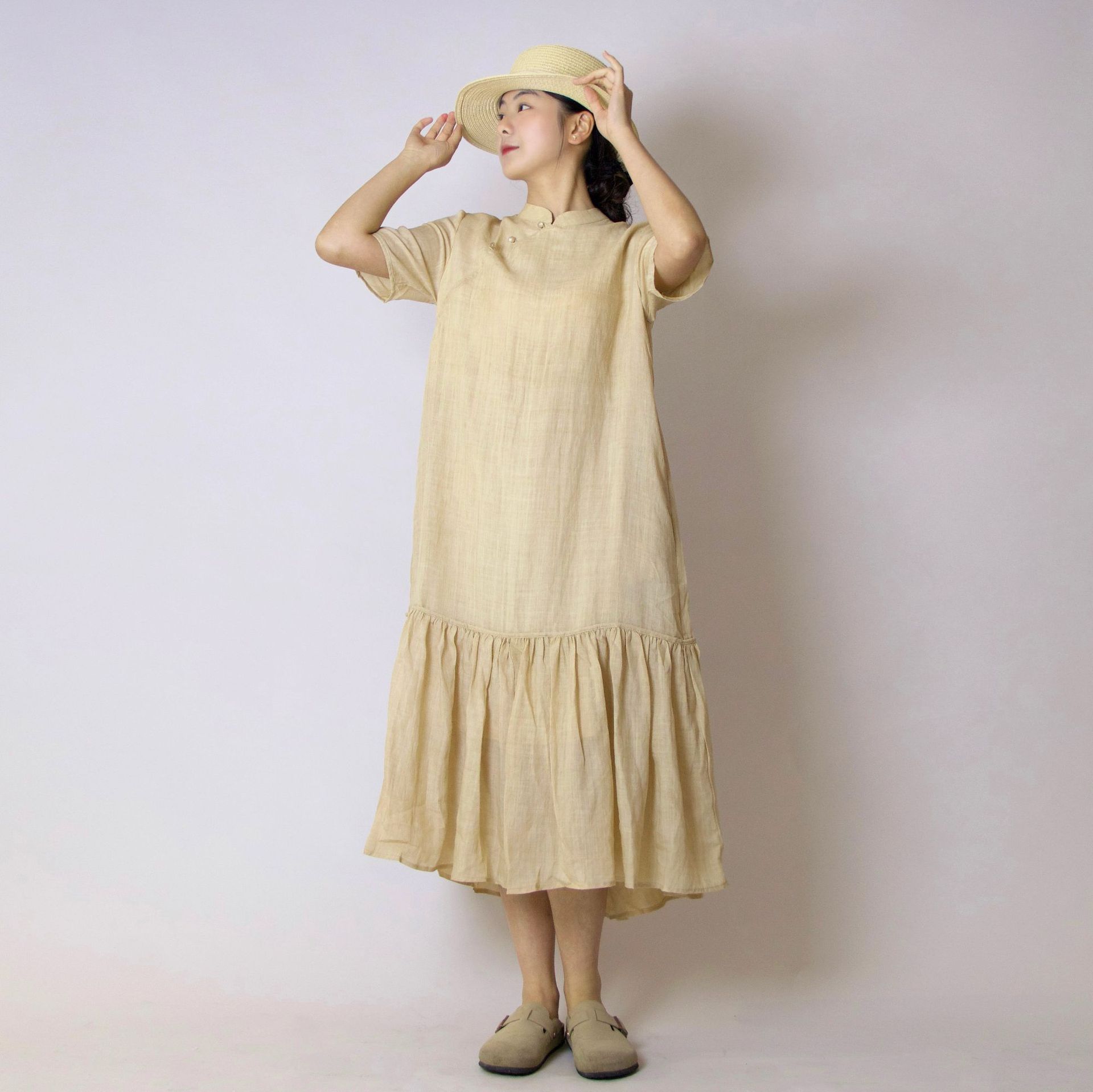 Rok Cheongsam Modifikasi Artistik Retro Warna Goreng Ramie Terlihat Langsing Longgar Model Baru Musim Panas 2025 Gaun Ekor Ikan Gaya Tiongkok