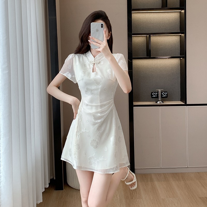 Rok Cheongsam Jacquard Kelas Atas Kecil Gaun Gaya Tiongkok Baru yang Diperbaiki Rok Pendek Elegan A-Line Pelangsing Pinggang Musim Panas