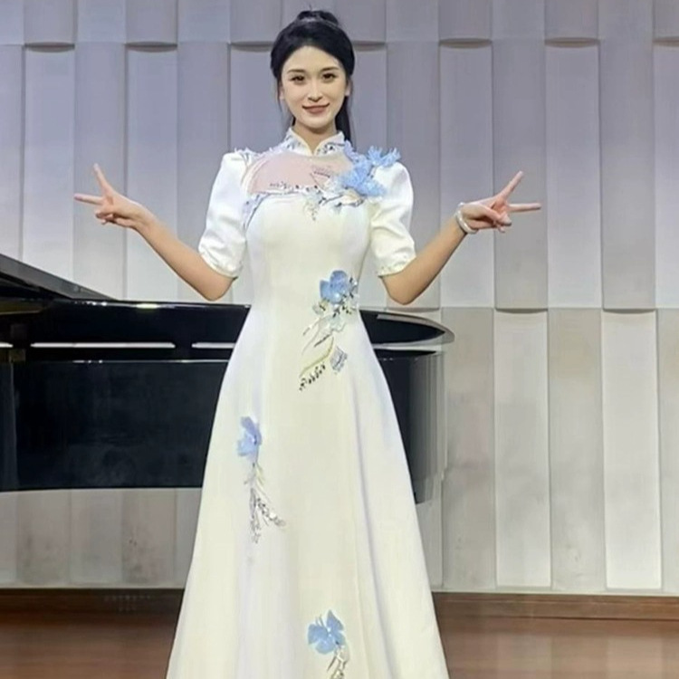 Gaun Panjang Setengah Lengan Kerah Berdiri Model Baru Pakaian Pertunjukan Versi Modifikasi Gaya Tiongkok Gaun Malam Host Model Baru 2025 Wanita