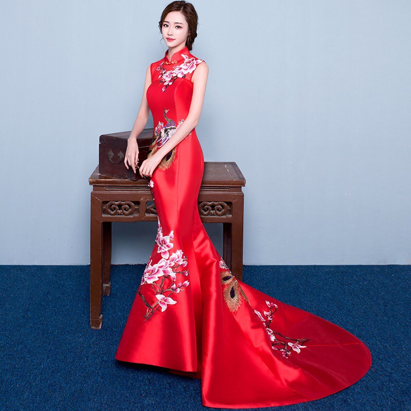 Gaun malam ekor ikan, gaya China baru pengantin pernikahan perjamuan gaun malam cheongsam roti bakar ekor bordir panjang klasik