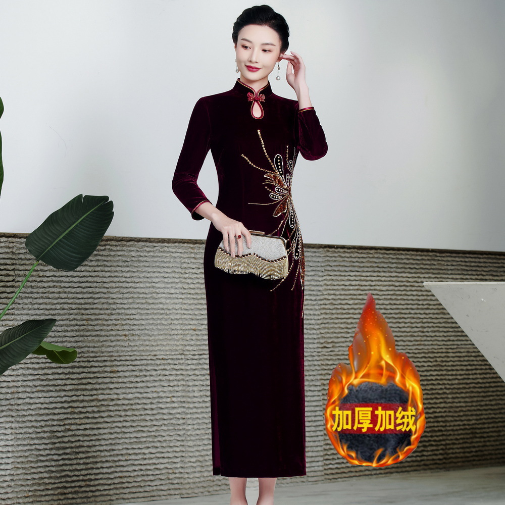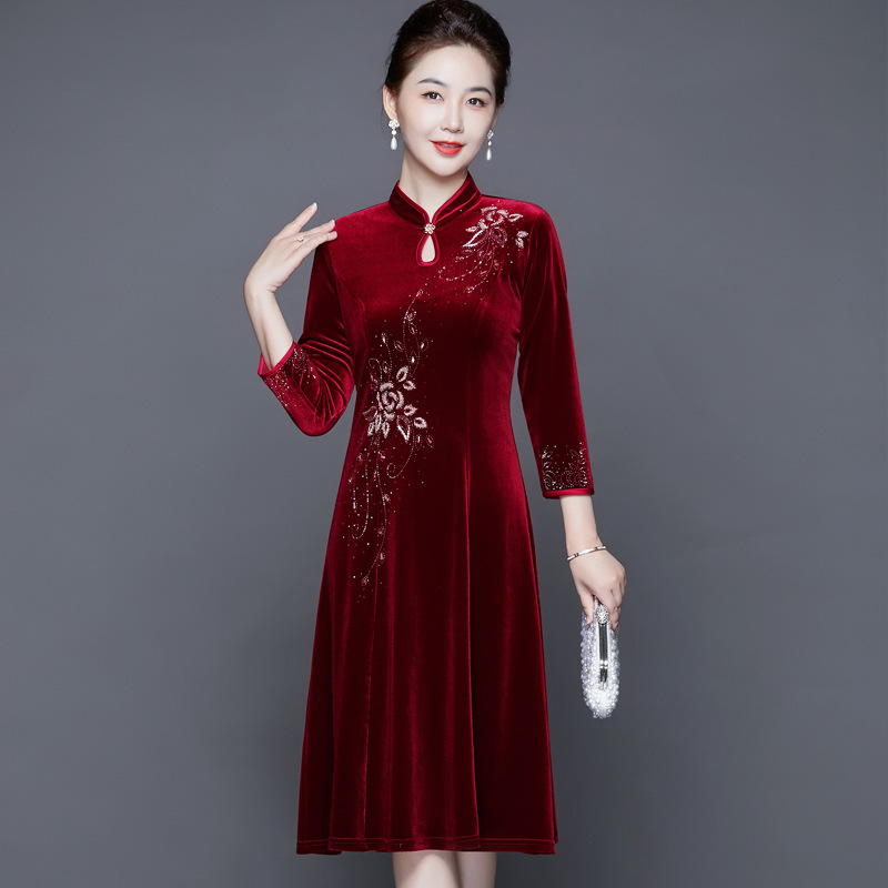 Cheongsam Cina elegan gaun swing besar Xi mother-in-law dimodifikasi beludru cheongsam gaun malam pernikahan cheongsam
