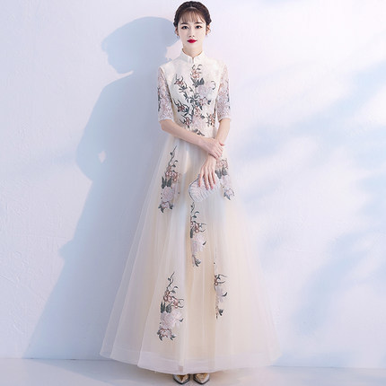 Pakaian Pengiring Pengantin Wanita Gaya Tiongkok 2025 Pakaian Pertunjukan Warna Sampanye Model Baru Retro Tinggi Terlihat Kurus Sisters Pakaian Pesta Malam Wanita