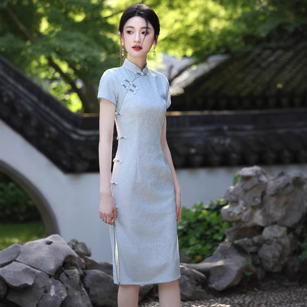 Gaun cheongsam anak perempuan muda bercetak elegan, Republik Tiongkok ditingkatkan komuter harian lembut baru musim panas 2024