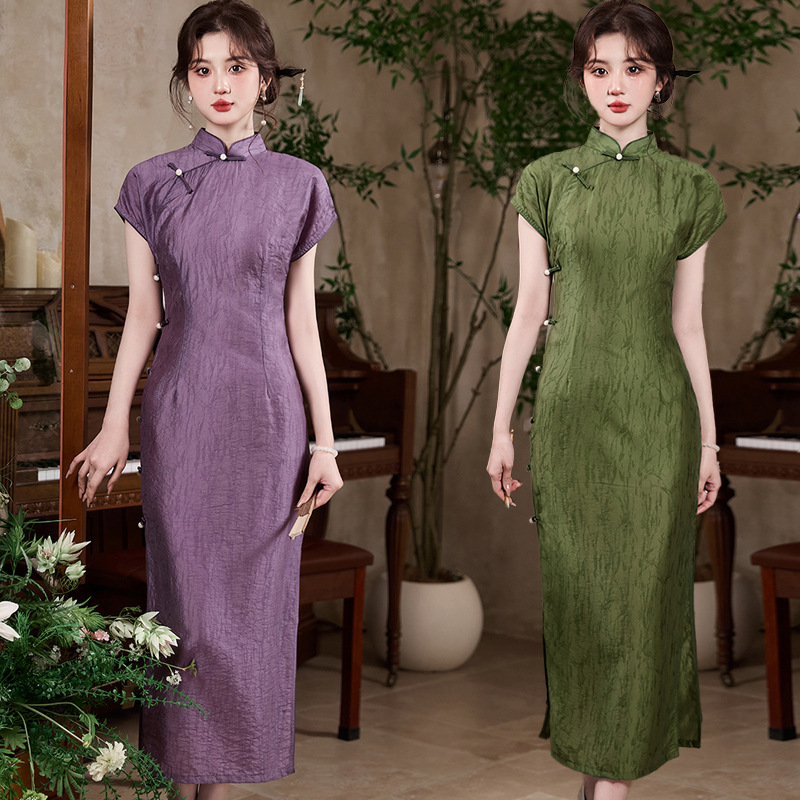 Cheongsam Model Panjang Sutra Nylon Model Musim Semi dan Musim Panas 2025 Gaun Sehari-hari Terlihat Langsing Membentuk Tubuh Gaun Wanita Pakaian Wanita Lapisan Tunggal