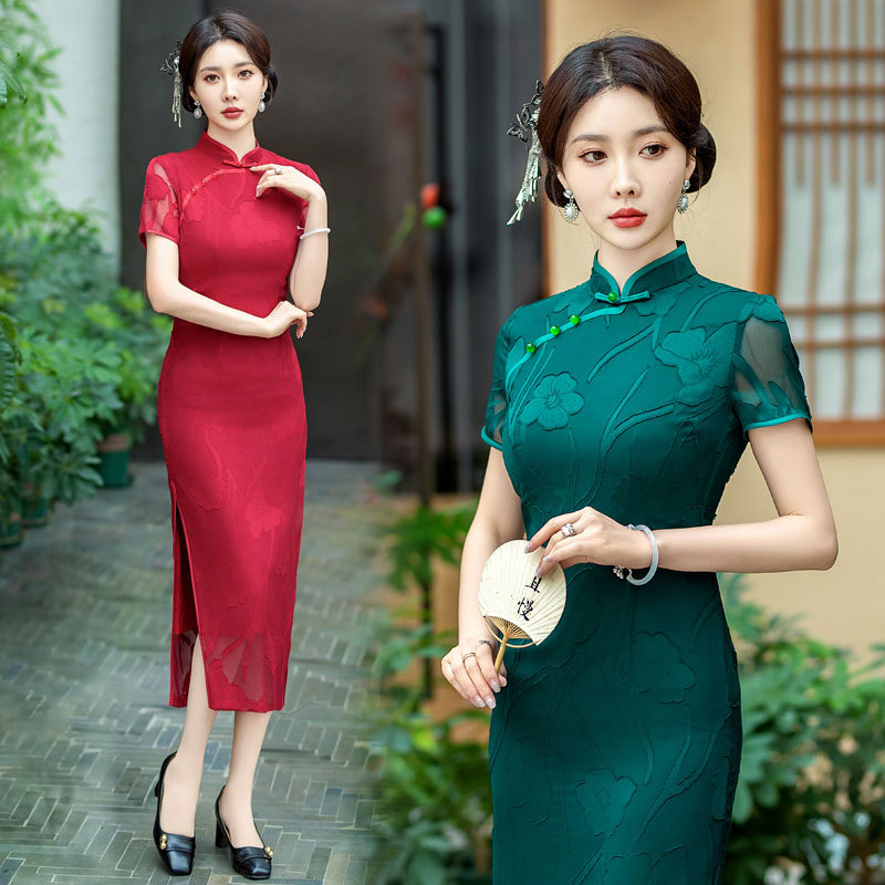 Gaun pernikahan lengan pendek, cheongsam retro kelas atas lengan pendek elegan untuk ibu