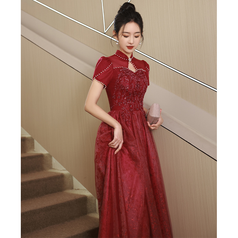 Toast gaun pengantin wanita, Gaun malam pertunangan merah anggur, kerah berdiri China baru, gaun roti bakar kelas atas 2024